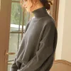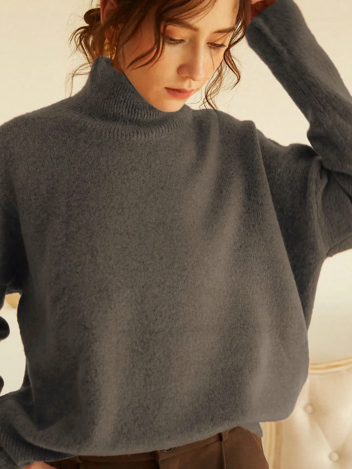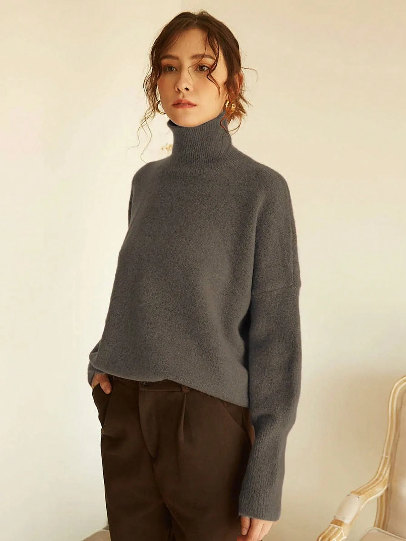 Gray Turtleneck Sweater with a drop-shoulder cut, straight hem, and elongated sleeves. Lightweight yet warm, with a softly structured drape for a clean, modern silhouette.